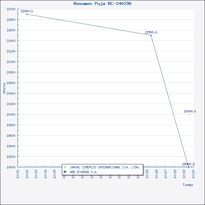 | Razón de adjudicación | La Comisión de Subasta, luego del proceso de PUJA realizado en el Portal del MIC, por unanimidad, resuelve recomendar al Señor Jefe de Materiales, adjudicar la Invitación a Cotizar 034-VPR-SUBASTA-2008 (RC-240296), para la Adquislción de Gabinete Metálico Completo, a la Cornpañía ABB Ecuador SA, por el valor de US$19.000,OO (sin IVA) y la entrega del material en 90 días. |