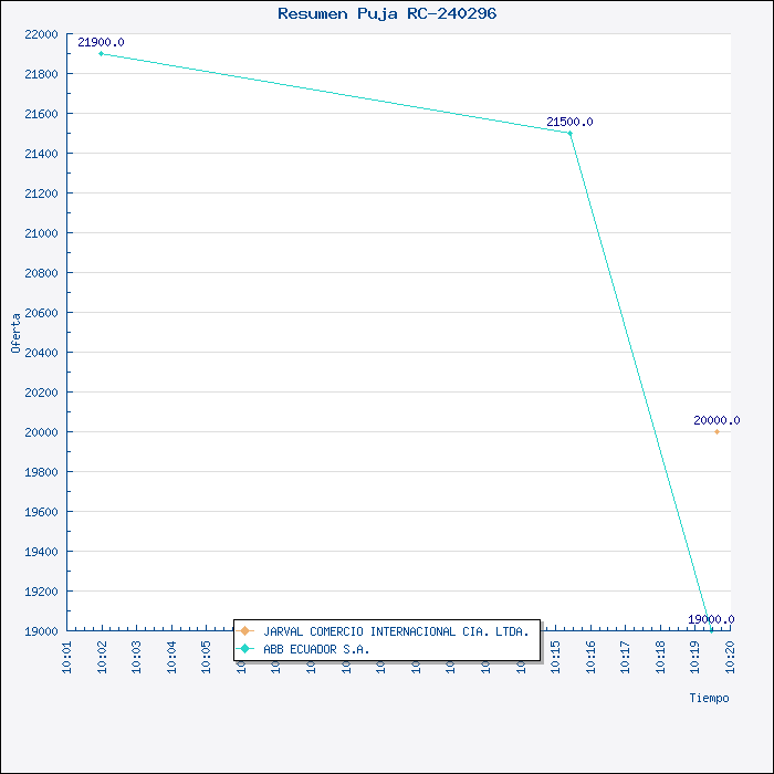 | Razón de adjudicación | La Comisión de Subasta, luego del proceso de PUJA realizado en el Portal del MIC, por unanimidad, resuelve recomendar al Señor Jefe de Materiales, adjudicar la Invitación a Cotizar 034-VPR-SUBASTA-2008 (RC-240296), para la Adquislción de Gabinete Metálico Completo, a la Cornpañía ABB Ecuador SA, por el valor de US$19.000,OO (sin IVA) y la entrega del material en 90 días. |