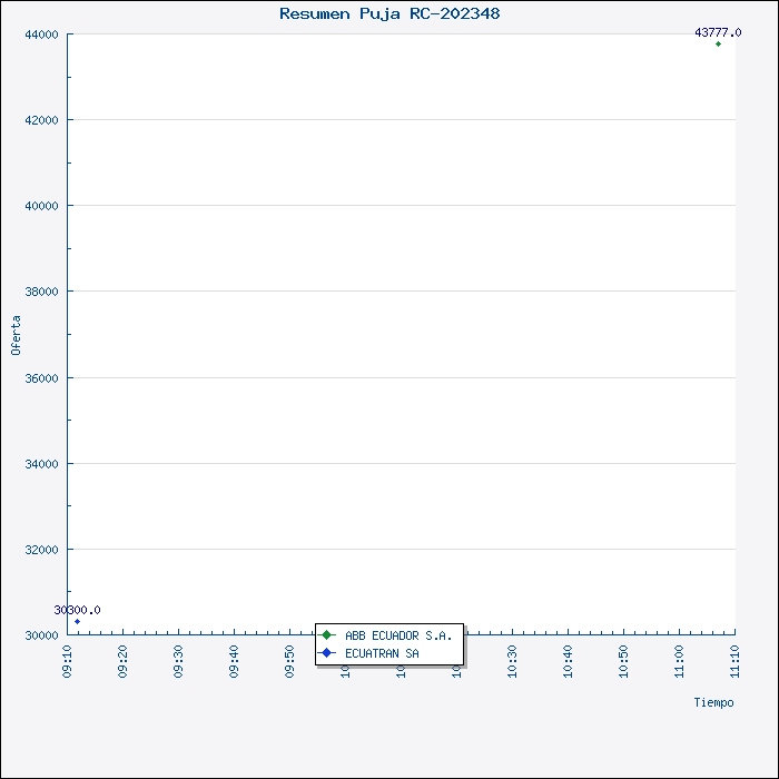 La Comisión, luego del proceso de PUJA realizado en el Portal del MIC, y luego del resultado obtenido, y en razón que la Empresa ECUATRANS S.A., presentó su oferta por US$30.300,oo (sin IVA), siendo la más baja y que cumplen con las condiciones técnicas, legales y económicas de la invitación, requeridas por Petroproducción, resuelve por unanimidad, recomendar al señor Jefe de Materiales adjudicar la Invitación a Cotizar 003-VPR-SUBASTA-2008 (RC-202348), para la Adquisición de Transformador Trifásico 1000 KVA TIPO PAD MOUNTED, a la compañía Ecuatrans S.A., por el valor de US$30.300,00, (sin IVA) y la entrega del material en 9 semanas. |