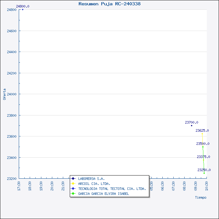 | Razón de adjudicación | La comisión, luego del proceso de Puja realizado en el portal de compras públicas del MlC, resuelve por unanimidad, recomendar al Señor Jefe de Materiales, adjudicar la Invitación a Cotizar No. 051-VPR-SUBASTA EN LINEA-2008 (RC-240338), para la Adquisición de Cascos Tipo Gorra, Colores Blanco y Azul, a la Señora Elvira Isabel García García, por el valor de US$ 23.250,00 (sin IVA) y la entrega del material en 75 días hábiles. |