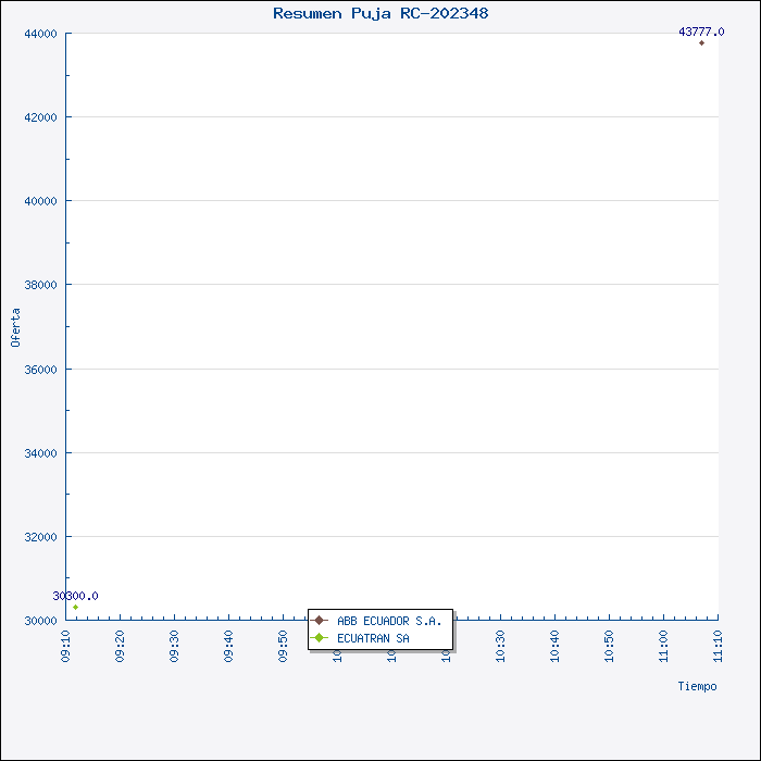 La Comisión, luego del proceso de PUJA realizado en el Portal del MIC, y luego del resultado obtenido, y en razón que la Empresa ECUATRANS S.A., presentó su oferta por US$30.300,oo (sin IVA), siendo la más baja y que cumplen con las condiciones técnicas, legales y económicas de la invitación, requeridas por Petroproducción, resuelve por unanimidad, recomendar al señor Jefe de Materiales adjudicar la Invitación a Cotizar 003-VPR-SUBASTA-2008 (RC-202348), para la Adquisición de Transformador Trifásico 1000 KVA TIPO PAD MOUNTED, a la compañía Ecuatrans S.A., por el valor de US$30.300,00, (sin IVA) y la entrega del material en 9 semanas. |